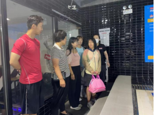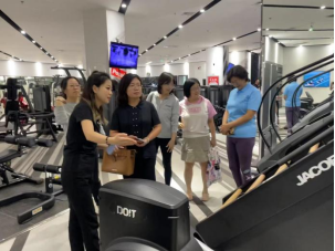在百胜健身俱乐部董事长王飞、教学总监王雅婷、会籍总监董永等人的陪同下,学院一行参观了瑜伽、舞蹈、搏击、器械训练、垫上普拉提、游泳等各个功能区,并对各个运动项目练习的注意事项进行了了解。
