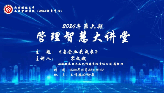 在立信楼104阶梯教室举办2024年第六期“管理智慧大讲堂”。本次活动邀请了优秀校友、太原市迎泽区第六届人大代表、山西领先云天文化传媒有限责任公司总经理宋文斌先生作了题为“与企业共成长”的专题讲座。讲座由学院党委副书记周志刚主持,年级辅导员及2023级全体本科生200余人参加。
