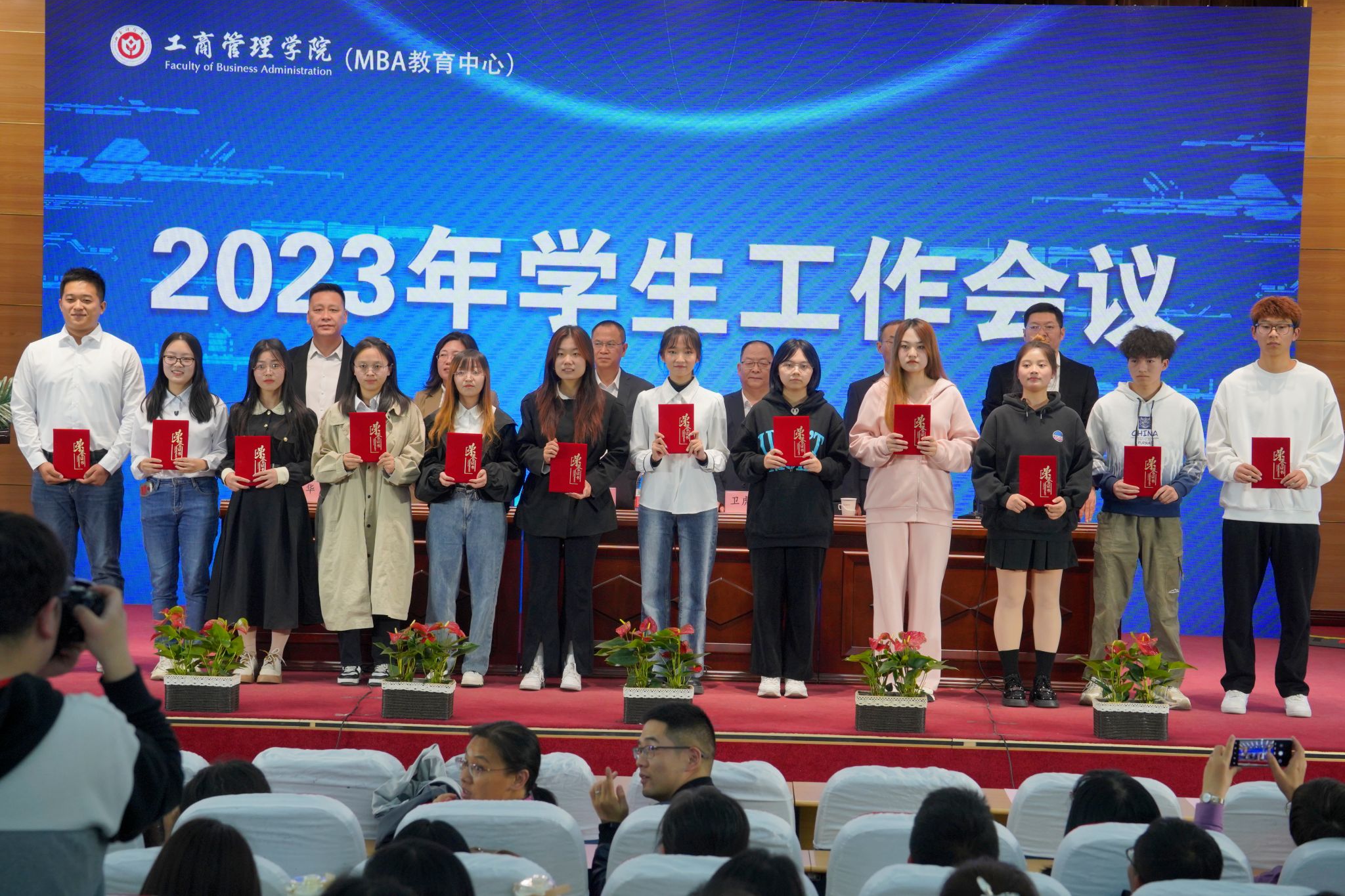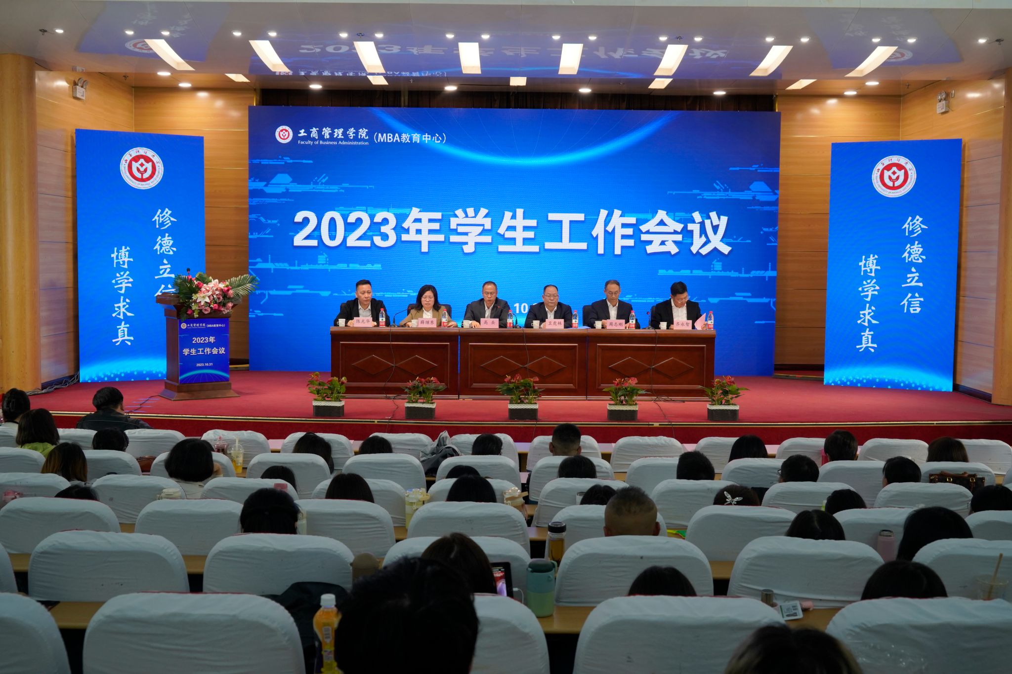 在立信报告厅隆重举行2023年学生工作会议。学院领导班子成员、全体教职工、2023级本科生和学术研究生、团学干部、MBA学生代表等参加会议。优秀校友代表、省政协委员、民革山西省委常委、学院客座教授、MBA教指委校外专家、太原市电力行业协会会长、长城电气股份有限公司董事长陈光华应邀参加会议。会议由学院党委书记高岳主持。