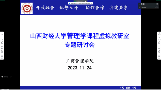 在学院会议室组织召开《管理学》课程虚拟教研室第一次专题研讨会,会议采用线上线下相结合的方式举行。北京语言大学、山西大学、太原科技大学、太原师范学院、忻州师范学院、山西工商学院等虚拟教研室成员、学院承担《管理学》课程的全体教师、管理原理及管理实务教研室有关老师共计30余人参加会议。会议由管理学课程虚拟教研室常务负责人马燕翔老师主持。
