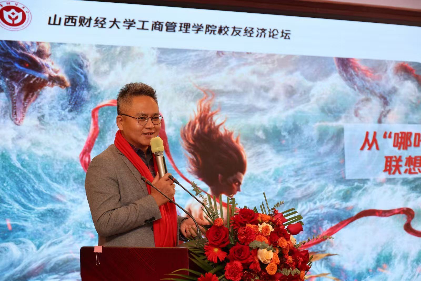 校友会副会长、山西智胜传媒科技股份有限公司董事长郭海明则以《哪咤闹海,校友弄潮——从哪吒联想到校友经济》为题,巧妙地结合电影中的经典桥段,生动形象的总结了关于校友经济的三点启示:人心中的成见是座山,但校友经济能移山;若命运不公,便和他斗到底。校友合力,方可化身“三头六臂”;我命由我不由天,校友当立封神榜。2007级物流管理校友、黑料不打烊