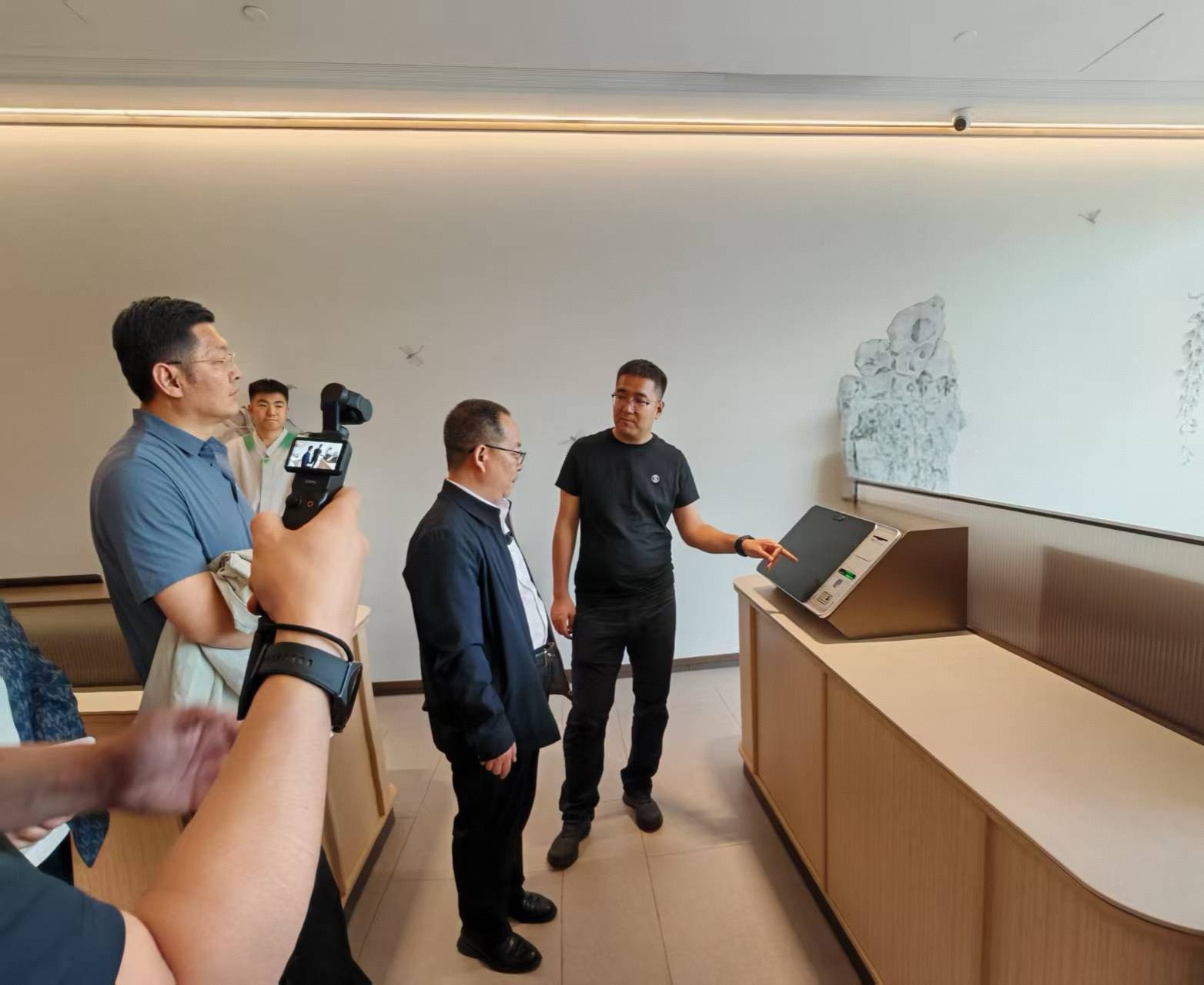 在张贵忠的陪同下,学院一行实地体验了融汇中华传统文化元素的数字化服务场景与智能客房。在酒店前台,参观了客人最快10秒自助办理入住服务的最新智能入住系统,不仅彻底解决了入住高峰时期的排队现象,还能通过自助办理实现精准选房、同住人添加等服务,感受到了人工智能对酒店行业的影响。从客房的墙面装饰到灯具的选择、房间设计布局,每一个角落和细节包括公共服务区域等都经过精心设计,融入了大量中国元素,营造出浓厚的中华文化氛围,使客人在住宿过程中感受到中国传统文化的独特魅力。