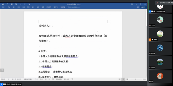 孙利虎老师和王红芳老师分别以锐仕方达和端若这两家人力资源管理服务公司为样本分享了案例开发过程。孙利虎老师就《工欲善其事,必先利其器:锐仕方达数字化赋能“猎才”》的案例初稿,从选题、写作框架、数据调研以及案例正文和使用说明的撰写等方面进行了介绍,与会教师对案例启发思考题的设置、案例正文写作风格以及课堂教学效果等问题进行了激烈讨论,提出了具有针对性的意见和建议。王红芳老师就写作提纲、思路以及写作过程中遇到的问题和困惑等方面分享了题为《双元驱动,协同共生:端若人力资源公司的生存之道》的案例初稿,与会教师就案例类型的选择、案例写作主题的敲定等方面进行深入讨论,提出改进建议,以进一步完善案例初稿,为今年的百优案例投稿做准备。