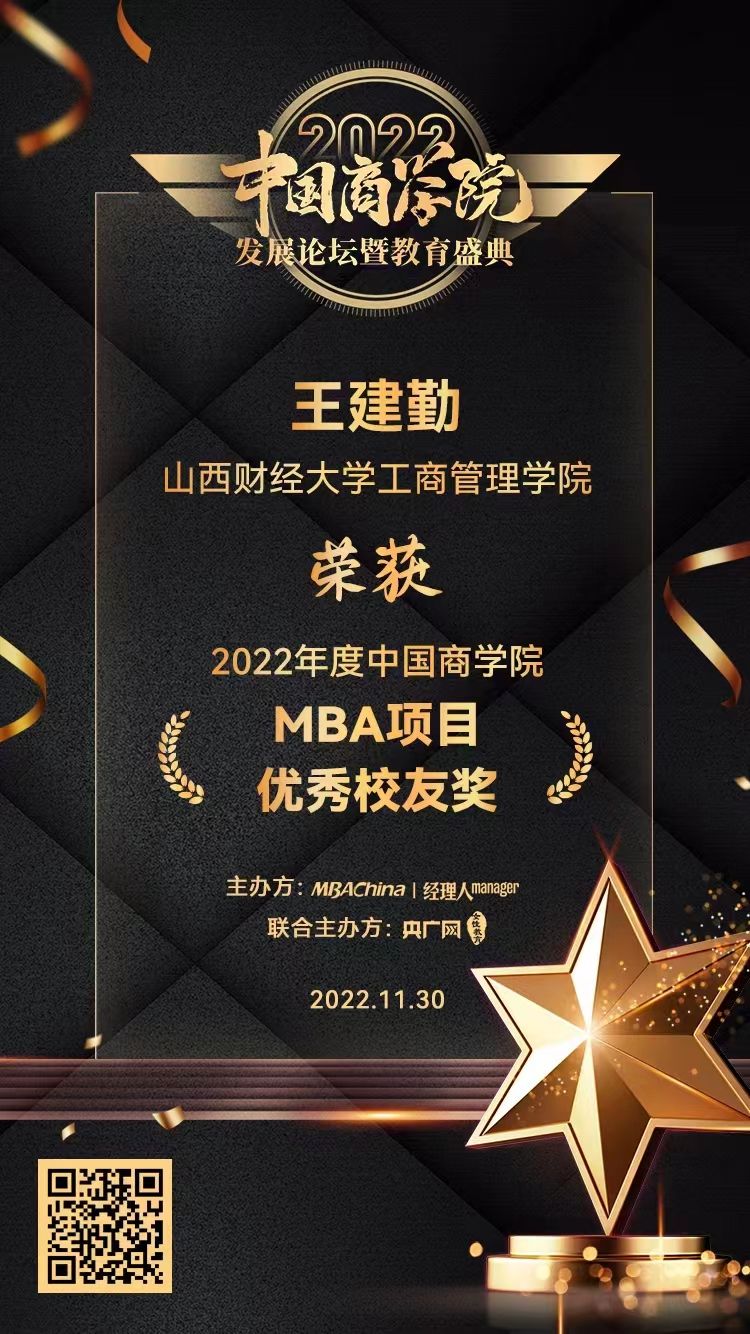 MBA校友会会长王建勤荣获“2022年度中国商学院MBA项目优秀校友奖”。