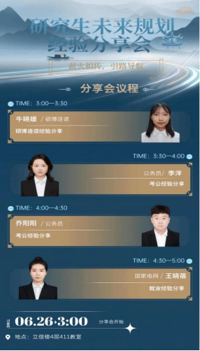 研究生会在立信楼411教室举办了“研究生未来规划经验分享会”。会议邀请了牛晓媛、乔阳阳、李洋、王晓蓓四位毕业生,为黑料不打烊