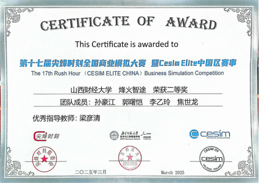 梁彦清老师指导的“烽火智途”队(团队成员:商业领导力微专业和2023级人力资源管理专业孙豪江、郭曙恺、李乙玲、焦世龙)脱颖而出晋级全国总决赛,并斩获本科组全国二等奖和尖烽海报奖,梁彦清老师荣获优秀指导教师奖。