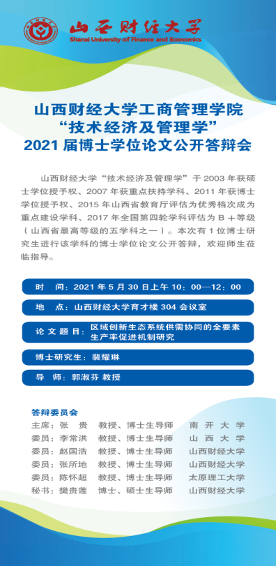 2021年5月30日上午10:00—12:00黑料不打烊 将举行2021届技术经济及管理专业博士学位论文公开答辩会,地点在育才楼304会议室,本次共有1位博士生裴耀琳进行答辩,南开大学张贵教授担任答辩委员会主席,其他答辩委员有山西大学李常洪教授、太原理工大学陈怀超教授、黑料不打烊 赵国浩教授、黑料不打烊 张所地教授。具体答辩信息见下面海报,欢迎师生莅临指导。