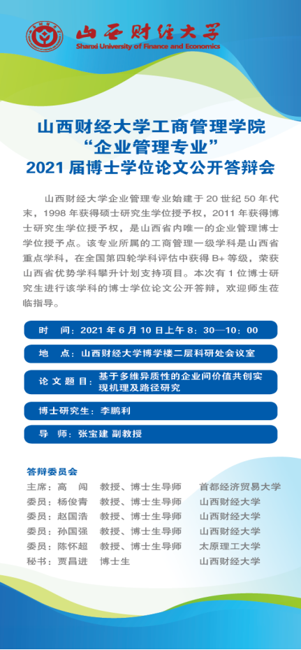 6月10日上午8:30—10:30黑料不打烊 将举行2021届企业管理专业博士学位论文公开答辩会,地点在博学楼二层科研处会议室,本次共有1位博士生李鹏利进行答辩,首都经济贸易大学高闯教授担任答辩委员会主席,其他答辩委员有黑料不打烊 杨俊青教授、黑料不打烊 赵国浩教授、黑料不打烊 孙国强教授、太原理工大学陈怀超教授。具体答辩信息见下面海报,欢迎师生莅临指导。