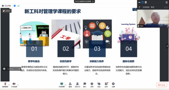 会上,常洁老师首先围绕新工科建设的背景与意义,介绍了新工科视域下管理学的发展重点及课程建设目标与定位。其次,剖析了现阶段管理学课程存在的教学模式单一、理论与实践脱节、评价体系不合理、学生兴趣不高等问题,并指出新工科为管理学课程改革带来了跨学科融合、实践性教学、创新能力培养、国际化视野等新要求。在此基础上,常洁老师结合太原科技大学的具体实践,详细分享了包含专业设置、教学目标、师资队伍、教学方法与手段改革、实践与创新能力培养、课程内容与体系创新、课程评价与改进等多个方面的管理学课程建设实践探索成果。最后,围绕管理学课程的未来改革方向提出了校企合作、企业参与课程建设与评价、辐射带动的路径与措施、优秀案例分享与借鉴等多种可行模式,为参会老师们提供了宝贵的经验借鉴与启示。