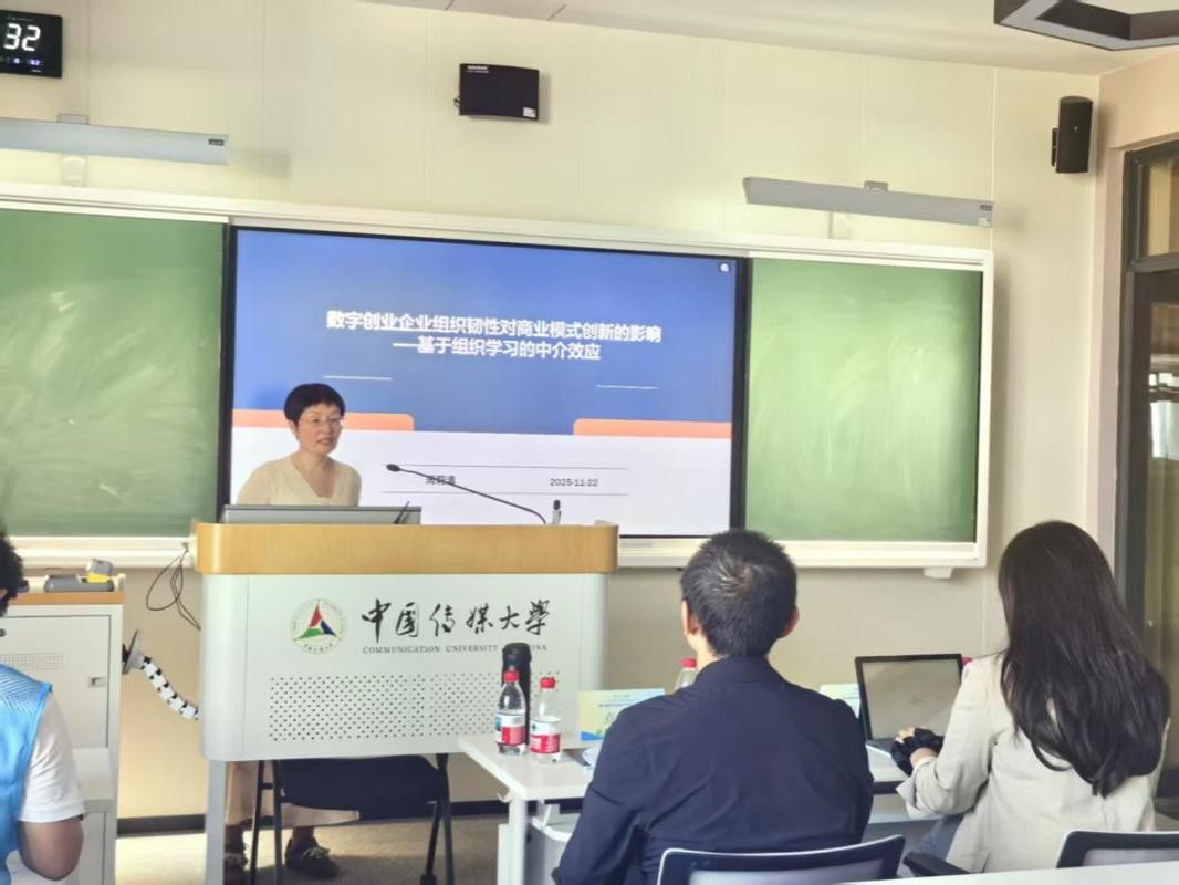 周莉清副教授作题为《数字创业企业组织韧性对商业模式创新的影响——基于组织学习的中介效应》的学术汇报。该研究立足数字创业企业这一前沿情境,从组织学习的中介机制出发,系统揭示了组织韧性向商业模式创新转化的内在路径,深化了对高不确定性环境下企业持续创新机理的理论解释。与会专家围绕研究模型的逻辑结构、变量测度的科学性及实证结论的稳健性进行了深入点评,并从理论拓展与方法优化两个层面提出了具有针对性的建设性意见,充分肯定了该研究在数字创业、组织韧性与商业模式创新交叉领域的学术价值与现实意义。