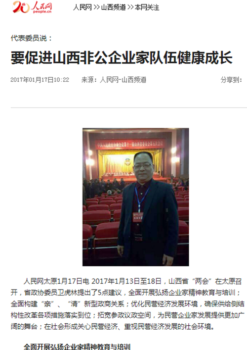人民网太原1月17日电 2017年1月13日至18日,山西省“两会”在太原召开,省政协委员卫虎林提出了5点建议,全面开展弘扬企业家精神教育与培训;全面构建“亲”、“清”新型政商关系;优化民营经济发展环境,确保供给侧结构性改革各项措施落实到位;拓宽参政议政空间,为民营企业家发展提供更加广阔的舞台;在社会形成关心民营经济、重视民营经济发展的社会环境。
