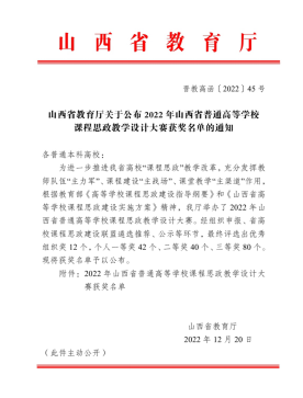 近日,2022年山西省高校课程思政教学设计大赛落下帷幕。根据《山西省教育厅关于公布2022年山西省普通高等学校课程思政教学设计大赛获奖名单的通知》(晋教高函〔2022〕45号),黑料不打烊