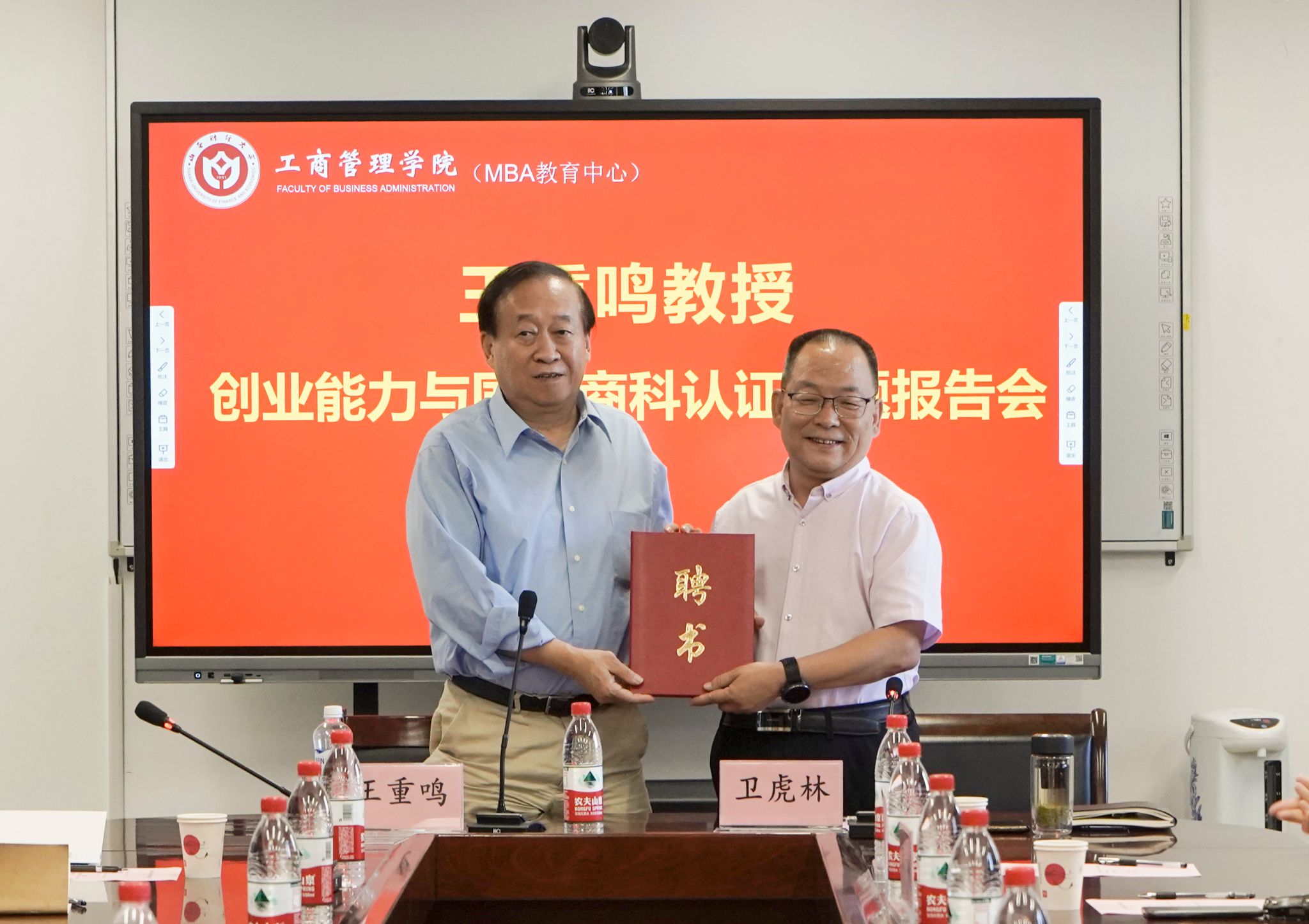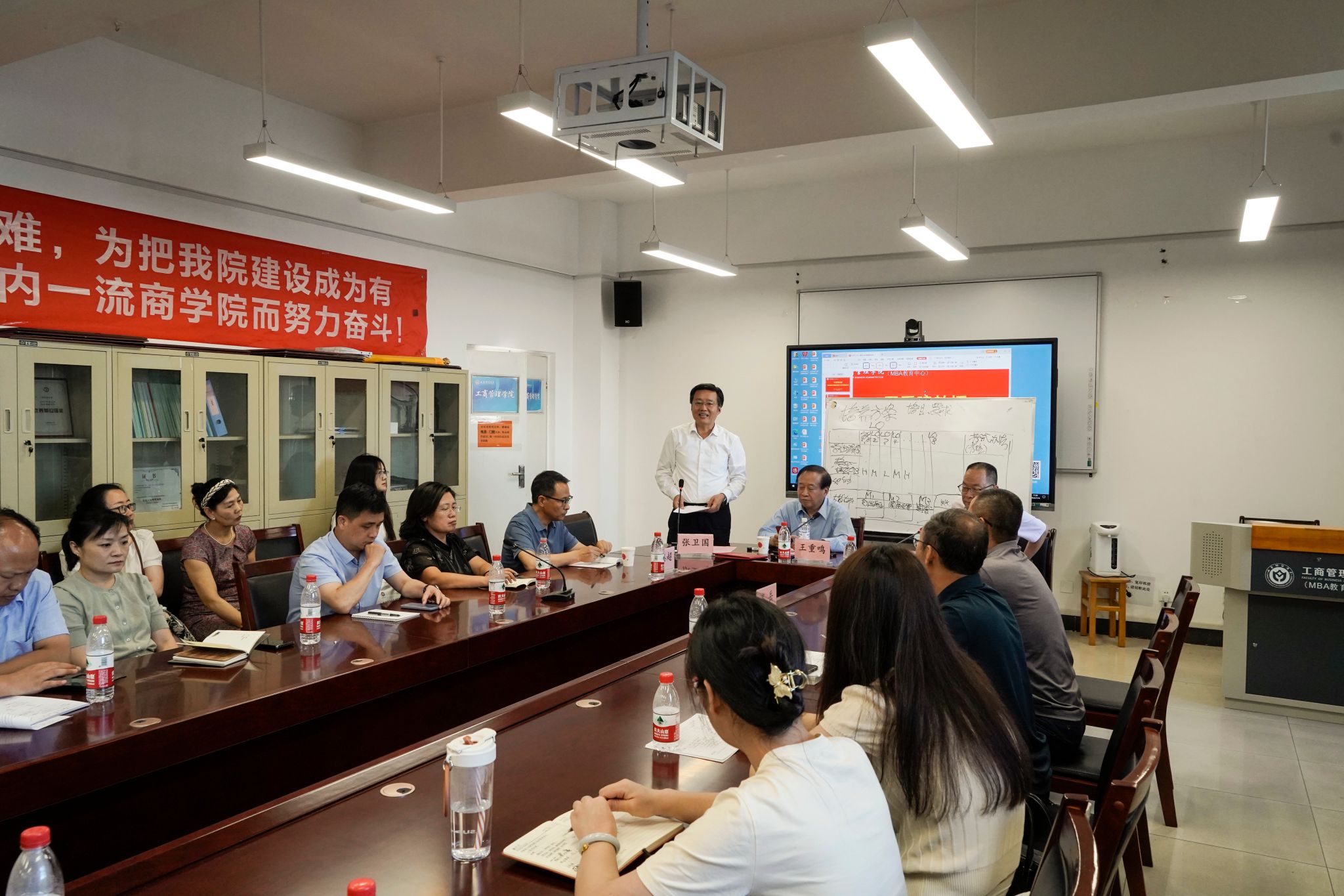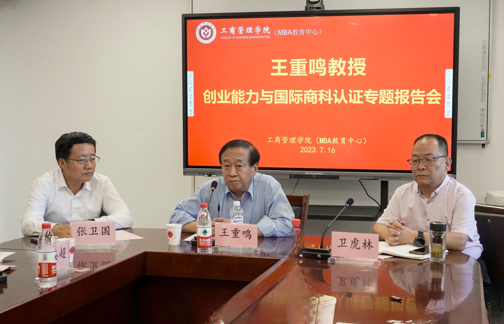 做创业能力与国际商科认证专题报告。校党委常委、副校长张卫国应邀出席会议。学校发展规划部负责人,学院领导班子全体成员、各教研室主任、国际认证团队成员、近五年新入职博士、MBA教育中心所有工作人员等50余人参加会议。会议由学院院长卫虎林主持。
