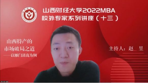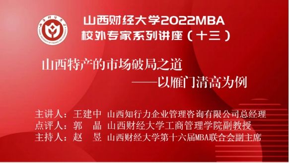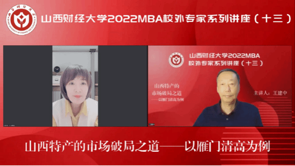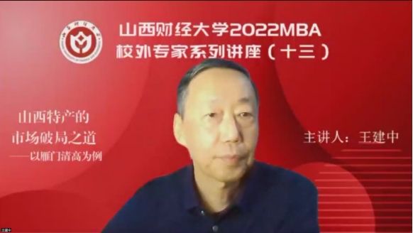 2022MBA校外专家系列讲座第十三期在“腾讯会议”平台圆满举办。山西执行力企业管理咨询有限公司总经理王建中带来了题为《山西特产的市场破局之路——以雁门清高为例》的专题讲座,2022级MBA学员、部分MBA教师、MBA校友、雁门清高产品团队等300余人参加,本期讲座还得到MBAChina网站的同步转播。