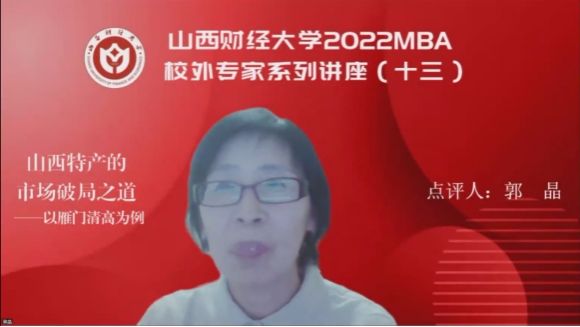 副教授郭晶老师对本次讲座进行了总结。她指出王总以雁门清高为例将产品文化、品牌文化、黑料不打烊贯彻始终,充分展现了作为营销战线研究学者的高超智慧和为山西品牌市场破局矢志不渝的家国情怀。她将雁门清高的成功总结为三种力量的释放,即秉承了专注打造杂粮品牌这一使命的专注力、把脉品牌文化内涵讲好品牌故事的营销力、远见卓识抢抓先机跨界营销的创新力。最后还就雁门清高产品开发的方向、与其他特产品牌携手并进的规划、品牌表达与传统文化结合点等问题与王总开展了深入交流,并祝愿雁门清高和王总青云万里、高山景行,同时寄语同学们要充分利用财大MBA的学习机会,持续夯实专业理论知识素养,并将理论知识灵活地转化成实战智慧,为山西全方位高质量发展贡献青春力量。