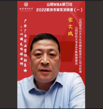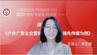 MBA教指委委员、山西领先云天文化传媒总经理宋文斌带来了题为《户外广告企业营销新策略--以领先传媒为例》的专题讲座,2020级、2021级MBA学员及部分教师近300人参加。本期讲座还得到MBAChina网站的同步转播,当晚播放量达2300余人次。